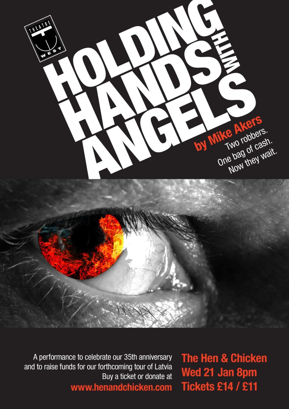 Holding Hands with Angels by Mike Akers (first produced in 1997!) is a tense, taut drama set in the hours following an audacious robbery. Two criminals wait in a safe house for further orders from their gangland bosses, with only a big bag of cash and a bottle of whiskey for company. What could possibly go wrong?